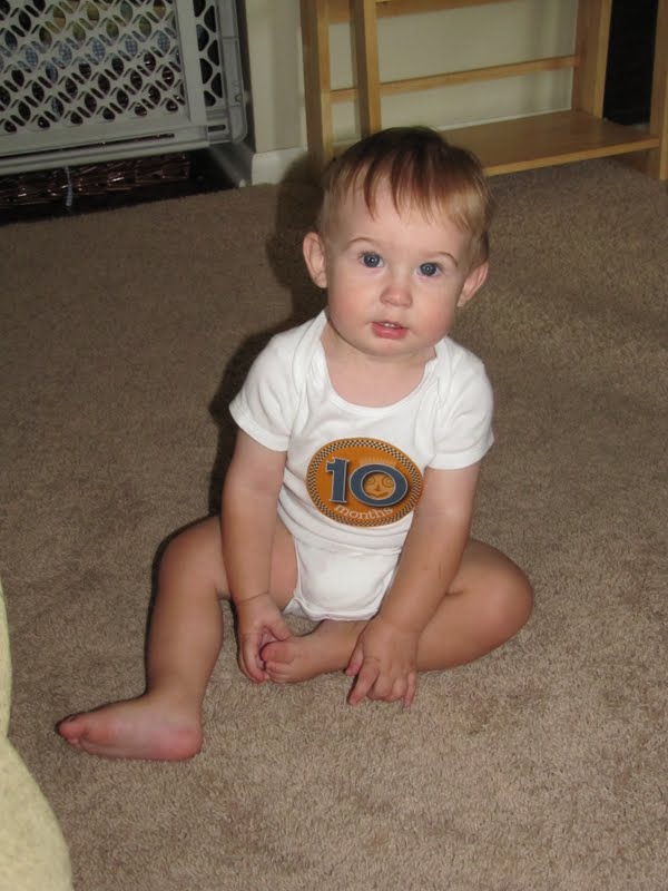 This boy is a TALKER! We are going to be in for it when he is older. Whether playing by himself, chasing after pets or playing with someone he loves to talk, screech, scream, babble, you name it. :) I think he is doing really well with vocabulary for a 10 month old. He already new mama, dada and baba, but now he's working on dog, diaper, cup, nap and "attempt's" a few more sounds to mimic what you are saying. Guess that means we are on the right track!